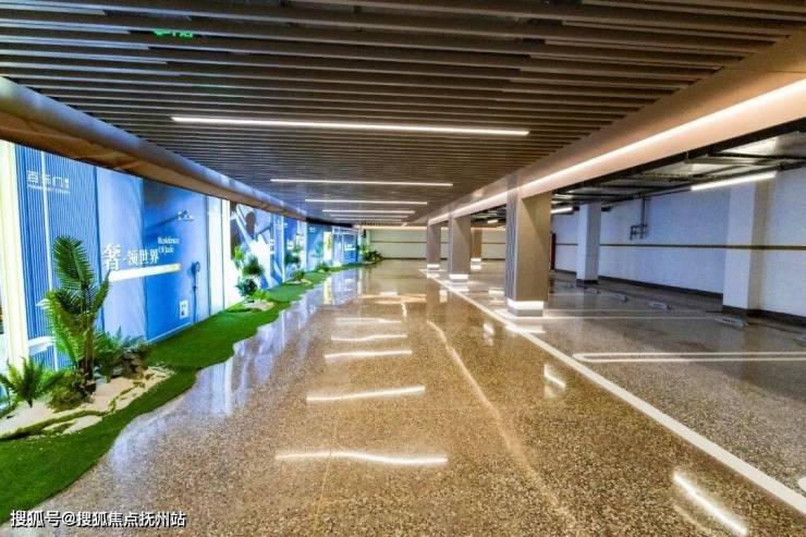 再将目光聚焦到一般项目容易忽视的地库空间。明亮阔绰的地库空间内,顶部以咖色格栅及吊顶光源重塑空间层次感,与之相对应的是在灯光下熠熠生辉的彩石地坪。