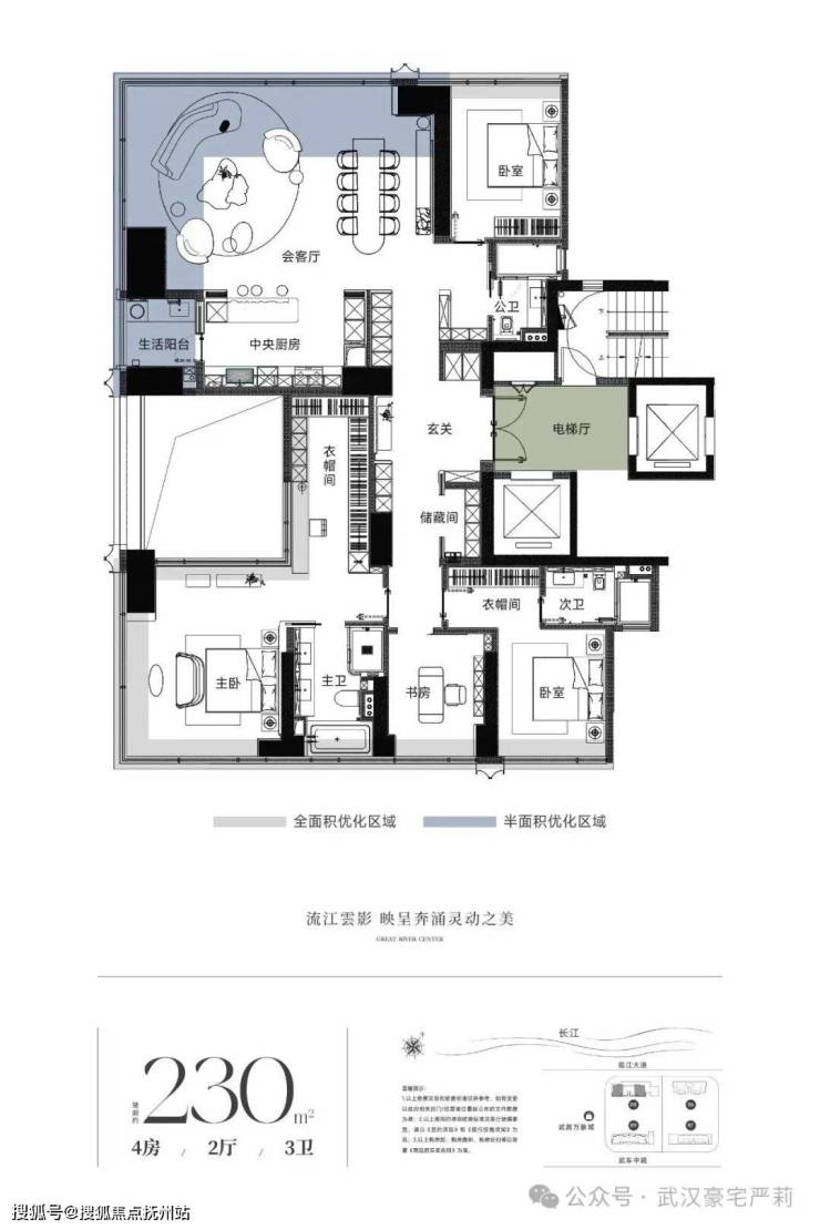 230四房,相比215来说,客厅变成了270度环幕,景观视野更好,同时把书房移到了南向,大人在客厅社交,孩子在书房学习,互不打扰。