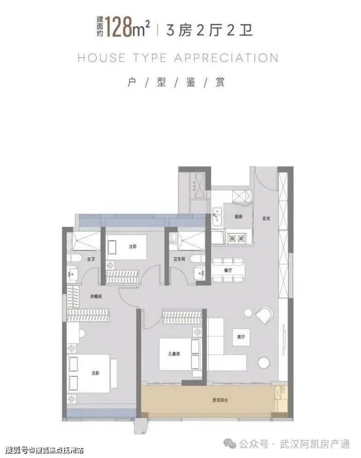 建面约128㎡户型(三房两厅两卫)