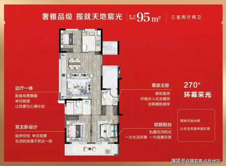 约95㎡户型,不仅纯边套设计此外还特配“双主卧”尊享空间。