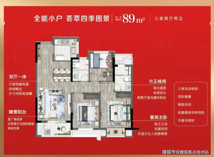89方不仅做到了三房两厅两卫的齐全功能,同时超大南向面宽使阳光充盈整个空间。