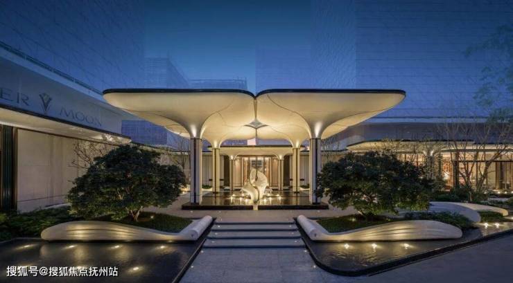 特选价值百万约200年树龄的日本茶梅;采用最长约13米的贝金米黄石材,整石切割的门头水景石材;标志性的芝兰玉树,从2:1到2.6:1进行比例迭新;架空层与街区圆融一体……