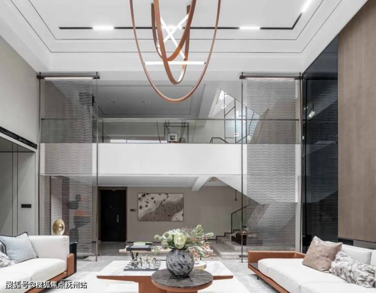 主体简约的基调向下延伸,仅凭借艺术装饰及材料的纹理丰富整体的层次感,层高的优势给予空间更多功能性的运用。