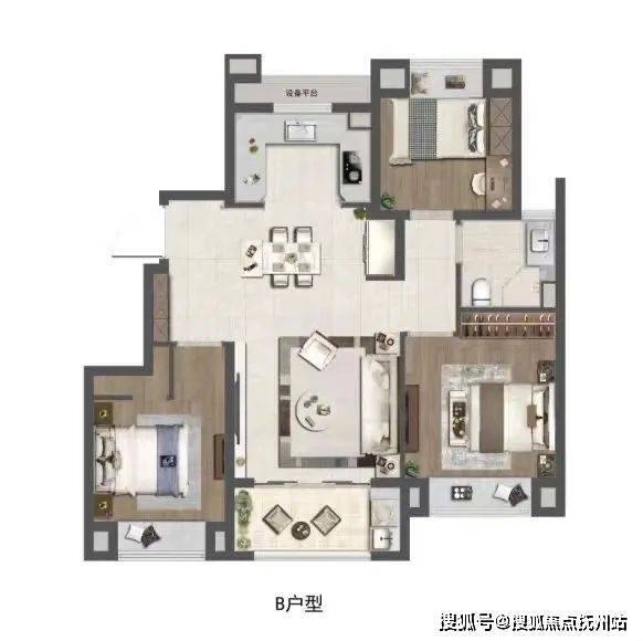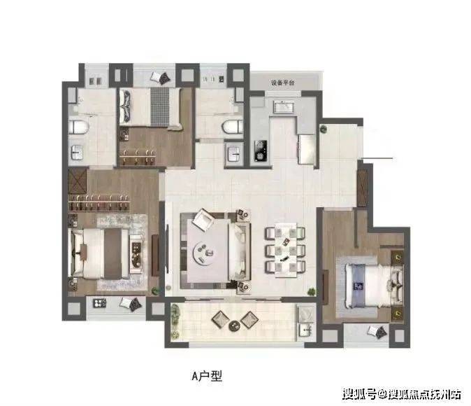 建面约98㎡的A户型,是一个3房2卫的户型。
