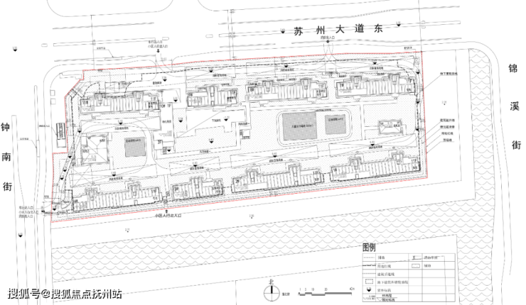 从平面图上看,小区北侧苏州大道东设置主入口,西侧钟南街结合1号线钟南街地铁站,规划有人行、车行及消防出入口,实现与地铁站无缝衔接。