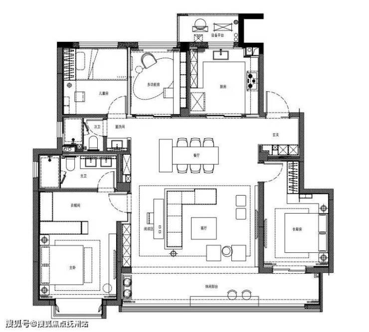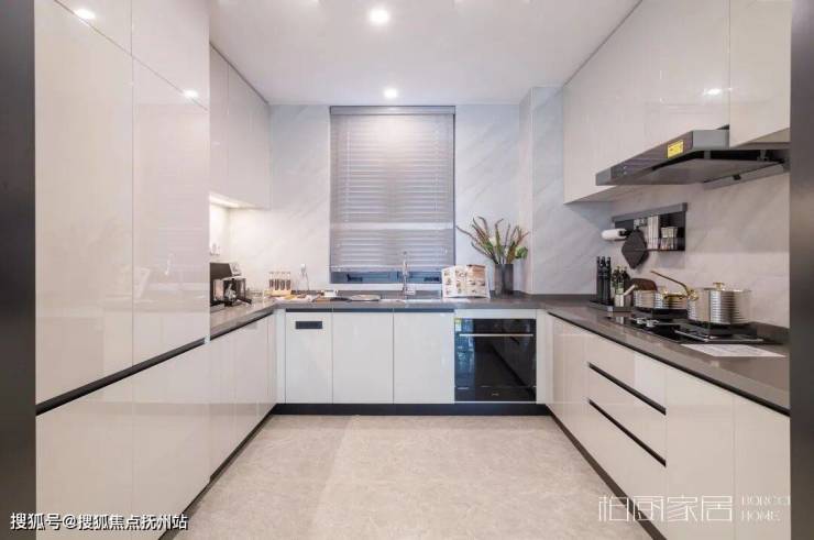 开放式厨房的处理,在厨房餐厅区域采取了回游式动线,浅色系搭配黑色线条的元素让空间更具备整体感,重新规划了布局,减少了不必要的走道,整个空间感更加通透。