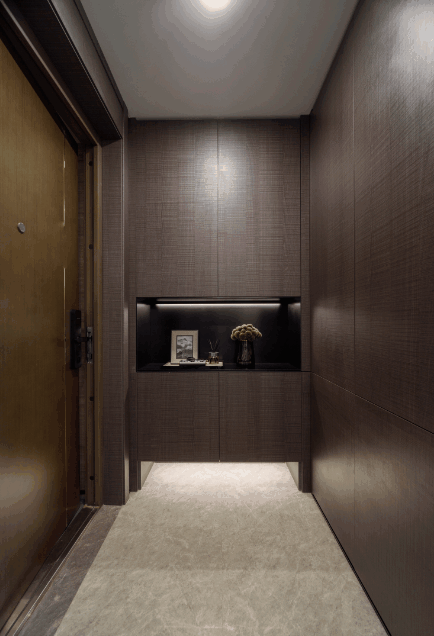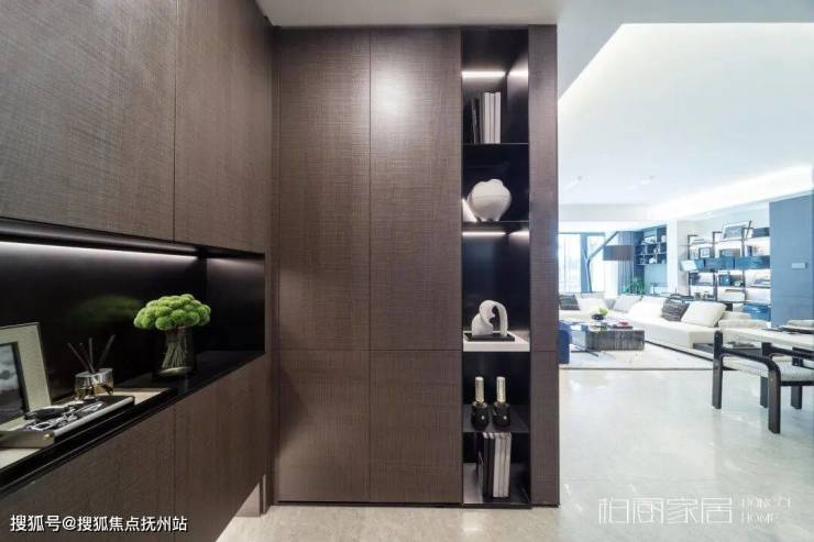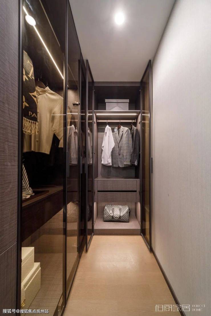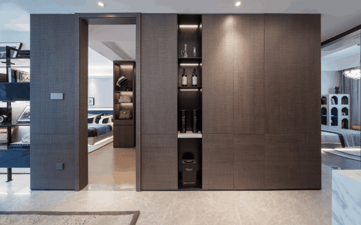 将功能动线进行有效的串联,通过一体化落地的表达形式,一目了然地看清楚物品,方便拿取,颜色上则以木纹搭配玻璃来呈现出简约又不失丰富,加以灯光,渲染别样意趣。