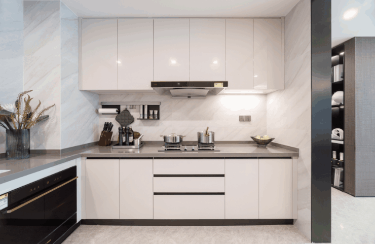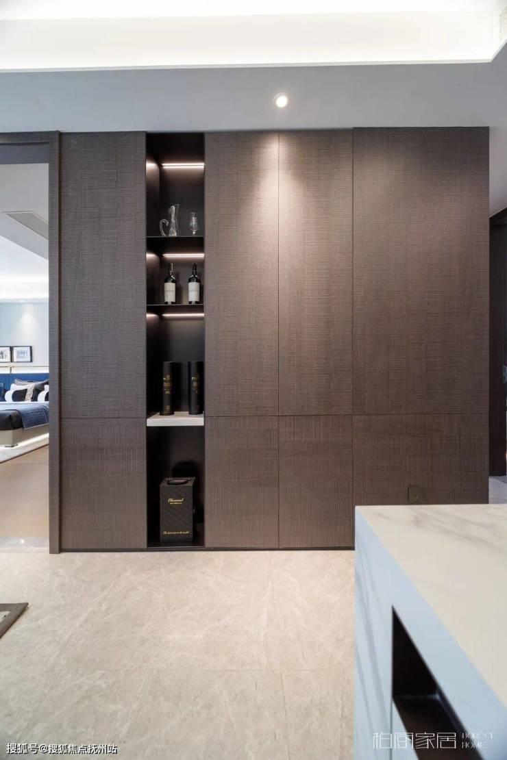 深色门板搭配不锈钢开放格 , 与整个空间的设计形成呼应 , 内部功能分区合理 , 搭配灯光不仅渲染氛围而且辅助照明 ,上方做20公分留空更加轻盈有层次感。