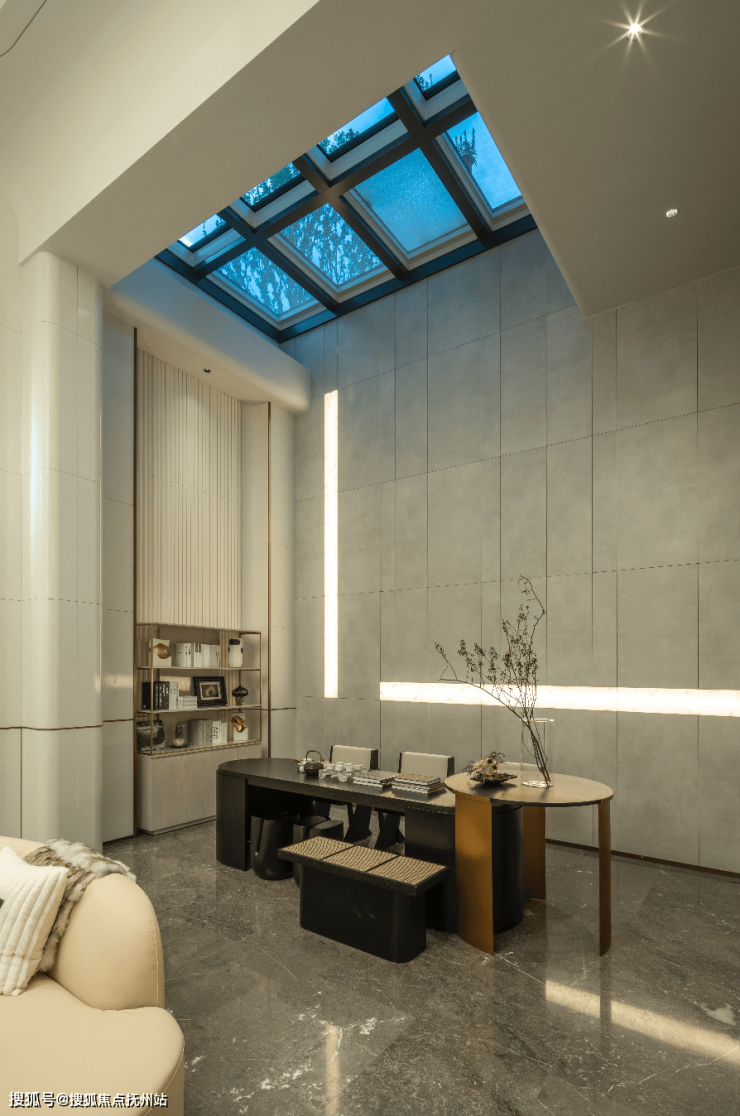 采光井下方放置大气的茶桌,搭配各样绿色植物,在此泡一壶茶,阳光与茶香一起入喉,细品时光悠然,无比惬意享受。
