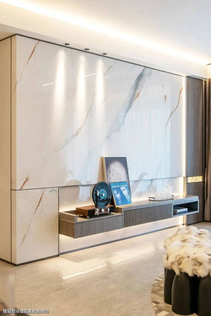 用材考究。地面采用的是蒙娜丽莎定制的大板砖,规格750mm*1500mm。这种通铺大板砖的交付标准在武汉很少见;客厅电视背景墙用的是岩板,相比一般项目常用的石英石而言,岩板更加坚硬、美观、耐用。