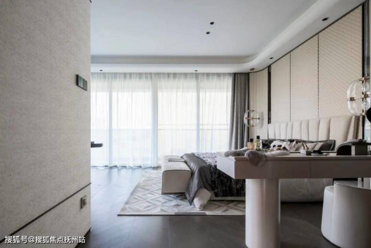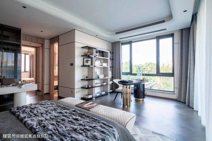二层主卧套房,奢享约42㎡的室内空间。精致衣帽间搭配梳妆台,构成女主人的专属小天地;大面的落地窗,将室内的视野进行极致放大,推窗见景,让居者每天都在院中美景的召唤中醒来。