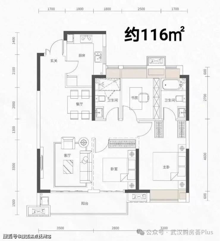 高层建面约116平三房两卫,约6米大阳台,4个飘窗设计,更多可拓展空间。
