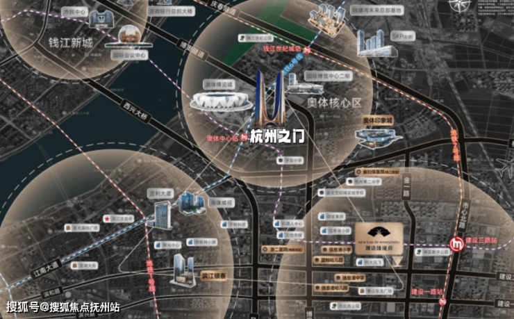 杭州之门位于萧山区钱江世纪城奥体板块核心区,地理位置得天独厚。东邻杭州国际博览中心,这里是举办各类国际盛事的重要场所,见证了杭州与世界的一次次精彩对话;南靠奔竞大道,这条充满活力的道路,连接着城市的过去与未来;北接七甲河,河水潺潺,为这座城市增添了几分灵动与诗意。