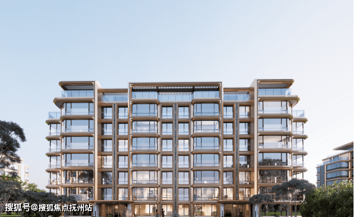 在东外滩,风貌别墅不少,云璟外滩没走那条路——不刻意模仿老建筑,而是用当代的建筑语言来做。外立面用了香槟金色铝板和玻璃,通过檐口、转角的处理,还原江水的流动感。部分墙体用了天然石材,和杨浦滨江的历史感呼应。大面积玻璃幕墙配上270°的环幕视野,将极致的自然景观引入室内。