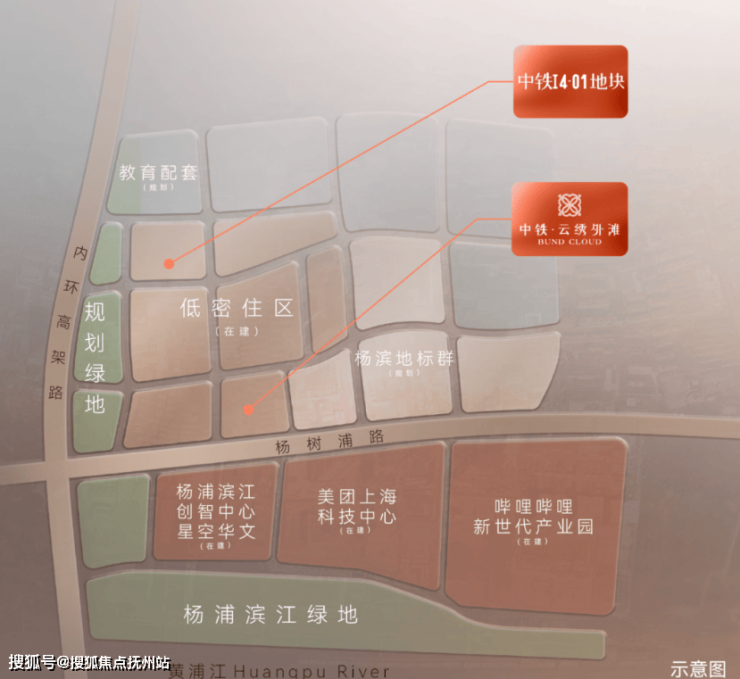 块属于杨浦滨江“九宫格”之一,紧邻内环高架、12号线宁国路站,直线距离滨江约700米。地块北面是一所九年一贯制学校,南侧是中建壹品·外滩元境;周边还有已经售罄的海玥外滩序BUND98、中建壹品·浦江之星项目。