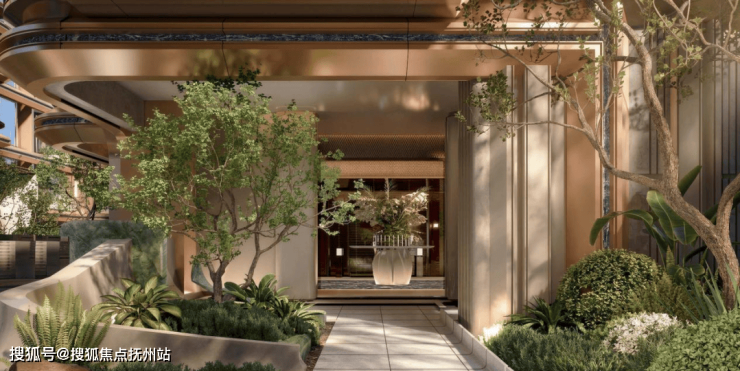 项目还规划了下沉式庭院,搭配叠水、绿植,形成立体景观。在滨江这种地段,愿意把土地拿出来做景观,本身就是一个态度。