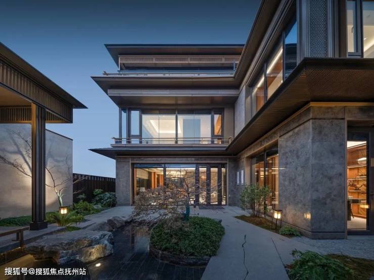 很难想象,就连合院的院墙也选用了金属格栅+局部石材,打造出自然又高级的质感。院门虽然是极简设计,却在局部浅刻了定制logo花纹,门把手上还镶嵌了奢石...