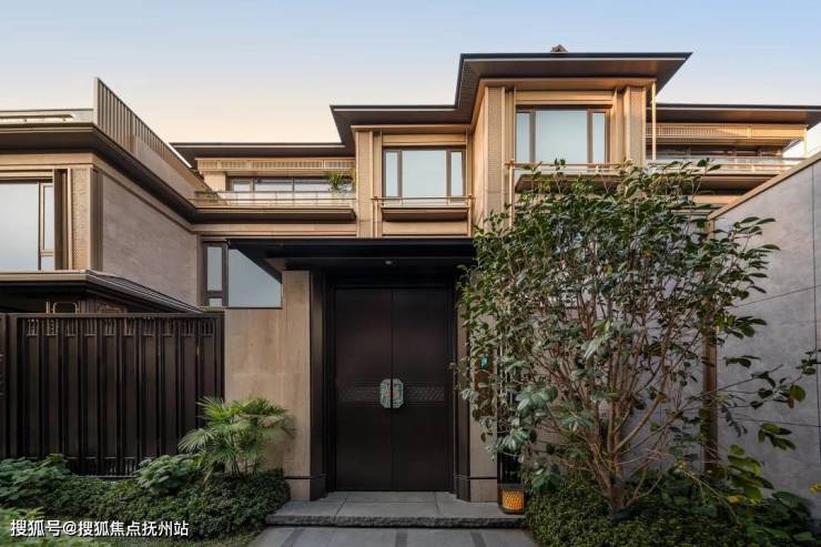 合院门头,别出心裁的选用“柴门形制+自然材质”。不同于其它中式产品 浮夸的“斗拱、匾额” 装饰,樾庐只是随意地用两根石质立柱+深咖色金属门扇”,轻轻几笔就勾勒出了隐逸之感。