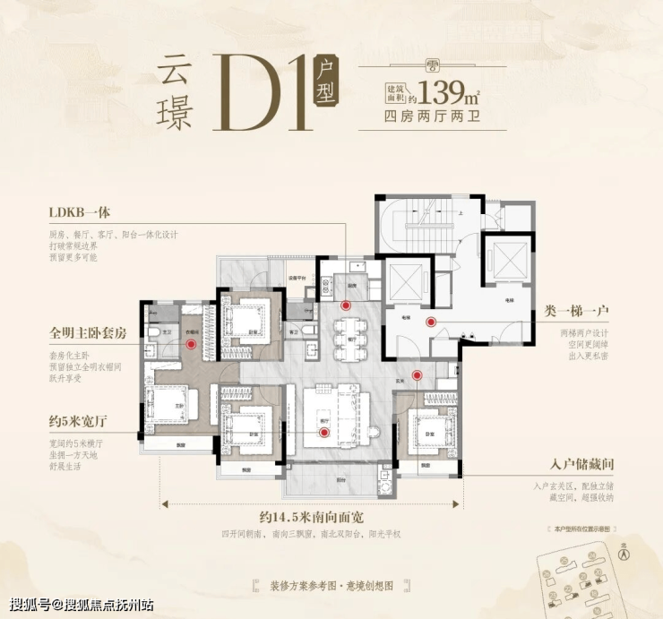 1、四大开间 面面朝南(南向面宽约14.5米)