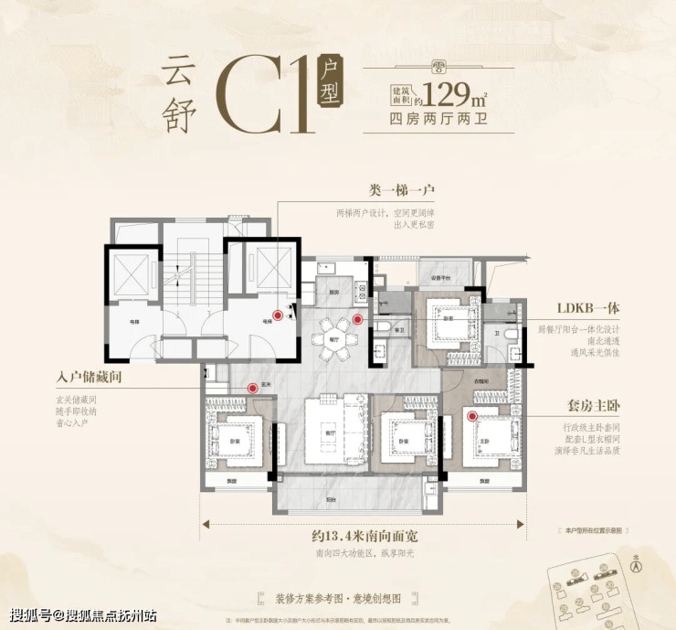 2、四开间朝南,南北通透(南向面宽13.4米)