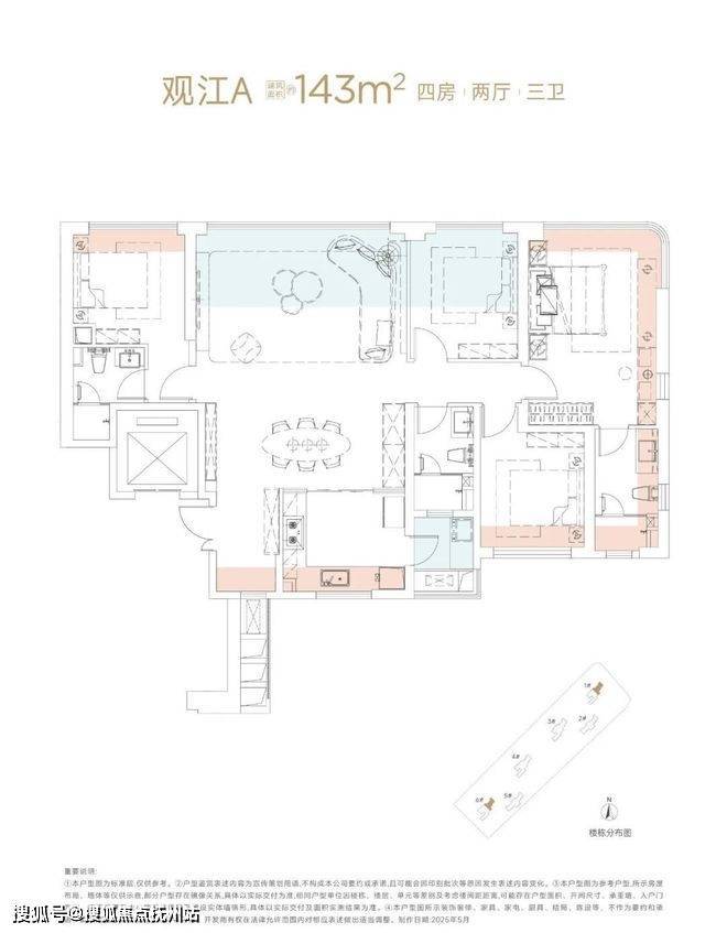 建面约143㎡是经典3+1居室户型,户型面宽可达市面少见的约16.3米,创新设计可变弹性空间,约9米宽的大横厅设计,实现更多生活场景可能。