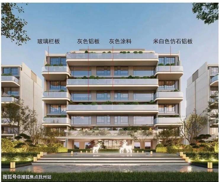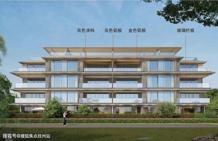 洋房外立面则是灰色涂料、灰色铝板、米白色仿石铝板和玻璃栏杆!