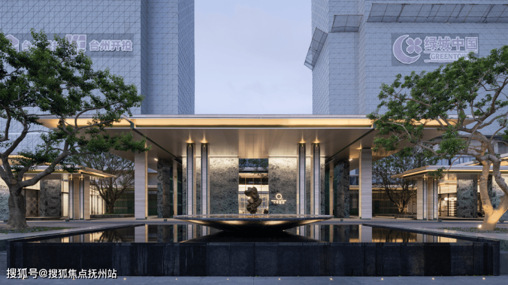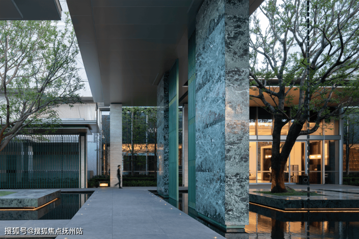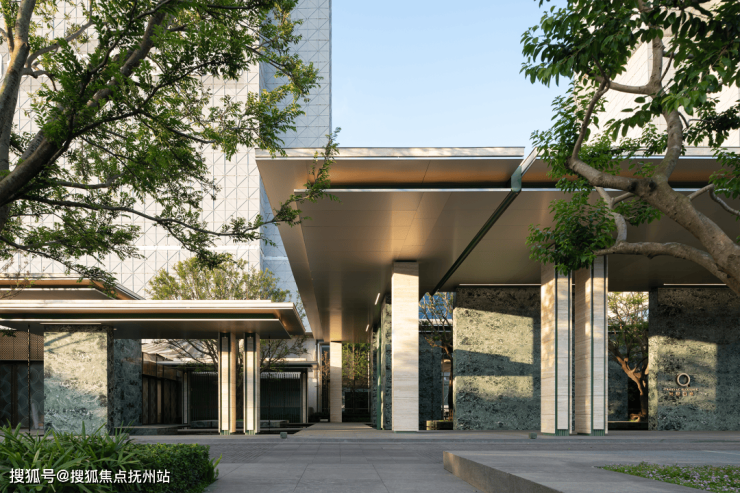 为了让住区在尺度、形象上不淹于周边林立的大型公建,我们在住区核心入口空间放大建筑尺度,通过高耸的墙柱和宽敞的顶盖创造公共建筑的尺度感与形式感。墙柱采用自然质感的米黄色洞石和墨绿色大理石,与城市绿荫相融,为城市提供了有生机的停留空间。