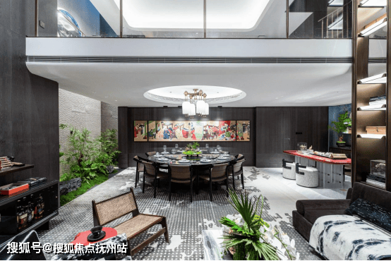下叠入户门边上还预留了日常的 800 库,可满足日常的收纳。会客厅连通餐厅吧台,外拓至庭院,形成 15 米的延伸景致,将户外的光线与植被一并揽入其中,并与景观茶室围合为一体,打破空间的界限感,形成一个无边界的聚会场域。