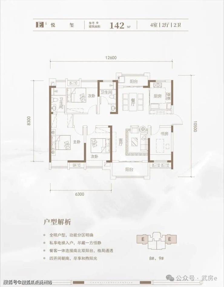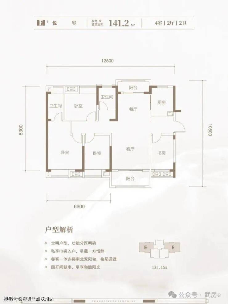 建面约141㎡、142㎡四房两厅两卫,户型方正,四开间朝南,12.6米大面宽设计,极致通风采光,南北双阳台,偏改善!