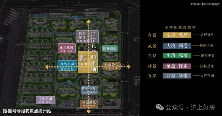 以江南人文精神为源点,打造两轴一环五进空间,江南礼序归家轴串联启迎盛礼、筑阙会友、归家华堂等5重礼制,尊崇归家;健康运动轴以24小时跑道为社区活力生活环,串联儿童乐园、长者康养、疗愈花园等10大生活场景,营造全龄全时的江南诗意生活
