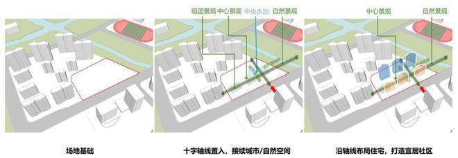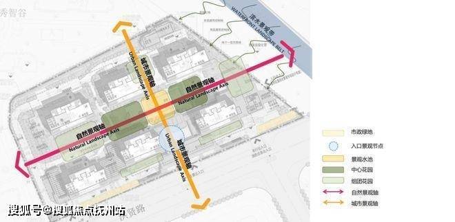延续“水乡绿城”的嘉兴文化底蕴,打造实景、立体的多功能生态森林社区。园区景观接续河景,形成东西向自然景观轴,实现人与自然和谐共生。南北向景观轴线从“展卷繁花”门庭至“花漾闲庭”后院,将园区景观南北延伸,打造城市景观轴。项目沿十字双轴布置住宅,营造生态宜居社区。