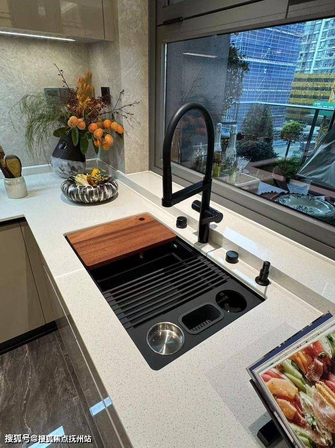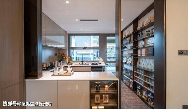 U型半开放厨房设计最大效率利用厨房空间,同时配备方太智能升降烟机及三眼灶具,您只需挥挥手即可开启烹饪之旅。建霖多功能水槽、方太蒸烤一体机及洗碗机也可让厨房操作体验更加便捷。