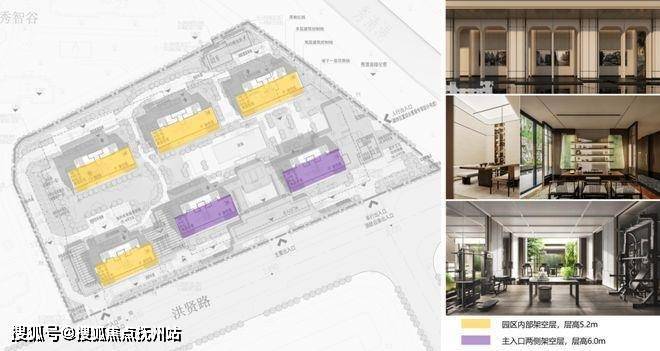 园区采用最高规格的全架空模式,主入口两栋架空层高度6米,其余高度5.2米。在架空层布置各类配套服务设施,包括艺术长廊、园区会所、儿童和老人活动空间、健身空间等
