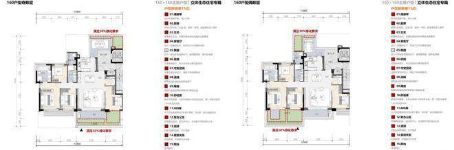 160方户型最大亮点是以LDKBG一体化的升维,南北通透,消弭了餐厅-客厅-厨房-宽境阳台-立体庭院之间的界限,将一个通透的全龄社交聚场呈现在眼前,让室内空间有机生长。户型严格按照绿城集团好房子户型15条设计标准进行设计与品质控制。南北双露台,北面与厨房和入户空间相连,南面与阳台相连,让空中花园的美好生活场景双倍呈现。160方得房率达到95%。
