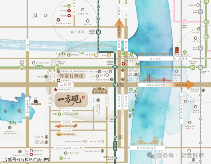 自驾:项目拥有三横(二环线、汉阳大道、杨泗港快速路)三纵(鹦鹉大道、江城大道、晴川大道)的立体交通路网,可快速接驳武汉三镇。