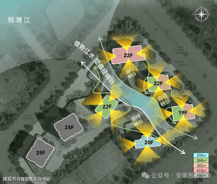 这样做的好处是:无论是前排的413方楼栋,还是后排的302方抑或是260方,大家都可以看江,以及所有楼幢都有园区景观。