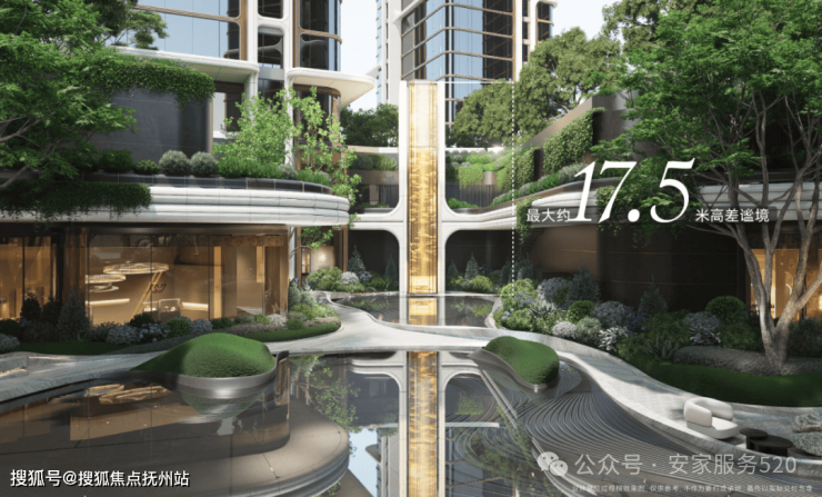 4、项目为新规后的“抬地式”设计,地面之下是峡谷绿洲,上面是纯粹的庭院花园。5.5米+6米双层架空,层高3.45米,4F住户(首三层)即可观江。
