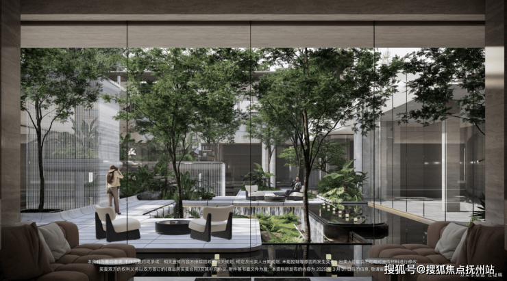 下沉式庭院,通过垂直景墙、悬浮观景台与叠水景观的立体交织,实现移步换景的视觉效果,也与会所空间形成无界交互。