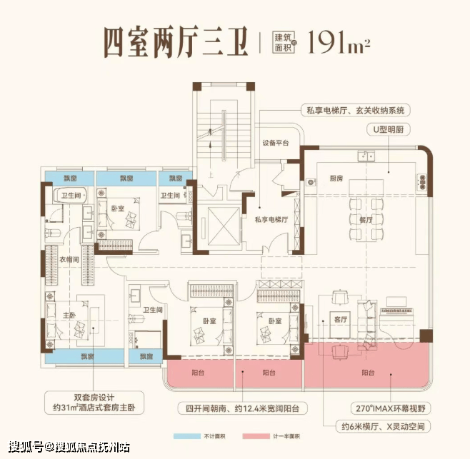 拥有私享电梯厅、玄关收纳系统,空间利用率高;U型明厨布局合理,操作便捷。约6米横厅搭配约12.4米宽阔阳台,实现270°环幕视野,朝南大面宽设计进一步提升居住舒适度。双套房主卧套房面积约31㎡,配备独立衣帽间和卫生间,私密性与尊贵感十足。
