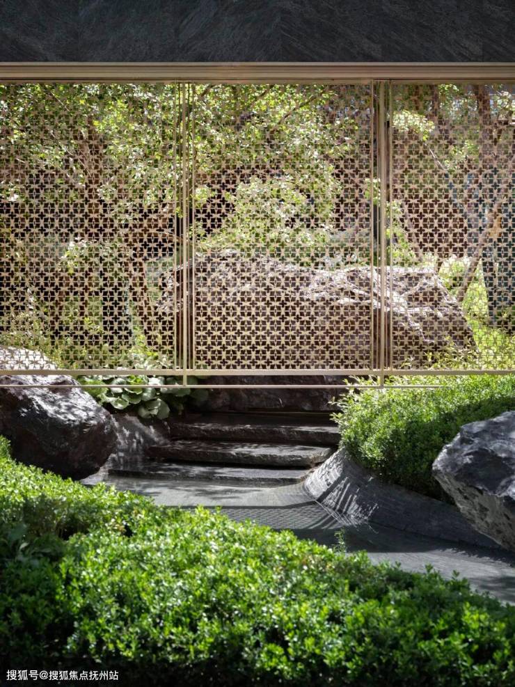 后场核心庭院:以“悬浮之境,自然诗学”为理念,于中庭水林苑之上构筑一方抬高的茶室。其构筑体量以轻盈之姿悬浮,与景墙形成浑然一体的雕塑感,塑造出奢雅、有序且极具艺术感的静谧空间。林居、镜池、水苑在此自然交融,生活被彻底浸润于风景之中。