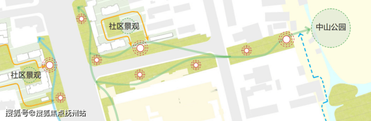 贯通的绿化带与多点放置的口袋公园及公共绿化空间;
