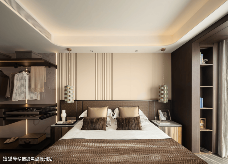 主卧搭配流光溢彩的金属灯具,散发一种内敛的奢华,让人感受到平和与尊崇。舒适颇有质感的地毯与床品相映,低调而不奢华,温厚而不俗雅。