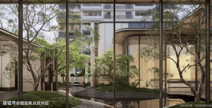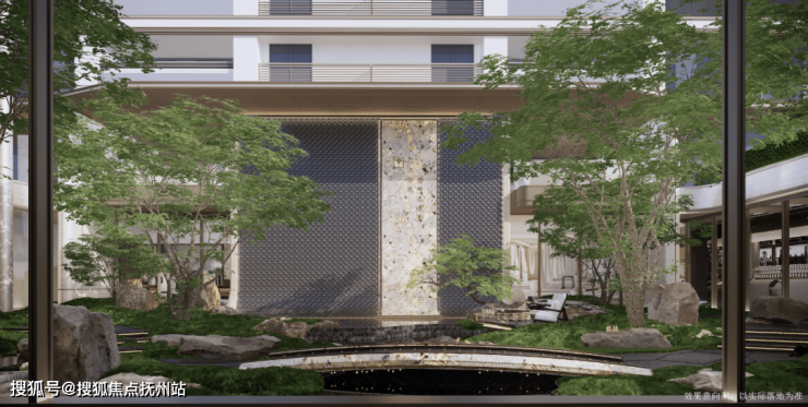 其中,涛影流金·下沉式庭院,撷取黄河第一湾之“形”,一座石桥静卧清波之上,叠瀑循阶而下,流水淙淙,庭中每株乌桕独立成景,让业主收获归家如入园的感受。