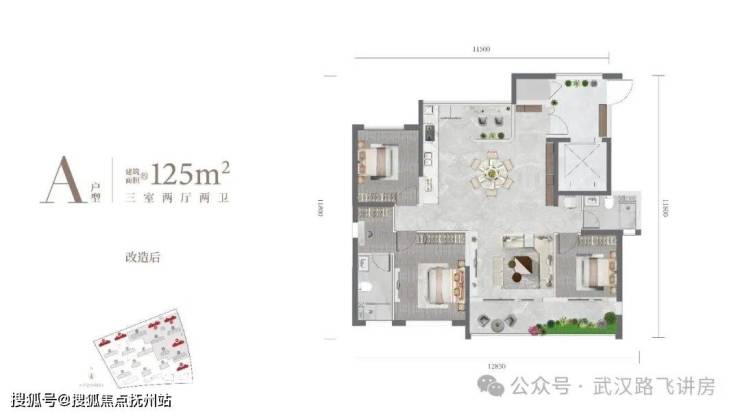 ①125㎡——三房两卫,这是该盘的门槛户型,非真四代住宅设计,无空中花园。但是94.6%的得房率也相当高了。有将近7个平方的私享电梯厅,这个配置头一次出现在这个面积段的产品上。
