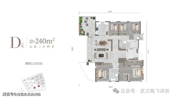 ④240㎡——五房四卫,该户型是项目最大的户型,仅位于2、3号楼,是13层的小高层,得房率高达111.87%!露台的进深可达4.8米,面积约26.4个平方,真正有空中花园的实感了。同时该户型的错层空中花园设计在角落,所以对于楼下的采光遮挡影响较小,但私密性可能还是有影响,如果对于功能性没有那么大的需求,五房完全可以改成四房,北向两个卧室打通成一间房。