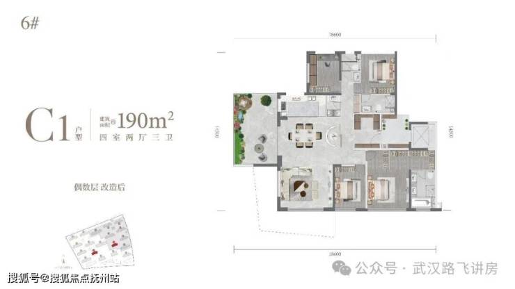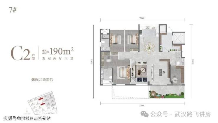 ③190㎡——四房三卫、五房三卫,这个面积段有两个户型。C1是四房产品,露台面积约27㎡,C2为五房,露台面积约19㎡。个人还是更偏先C1户型,大平层的体验感更强,并且客厅和卧室区域的采光不太会受到空中花园的影响。而C2户型受到的影响相对更多一些,主卧也没有形成270度的观景面。