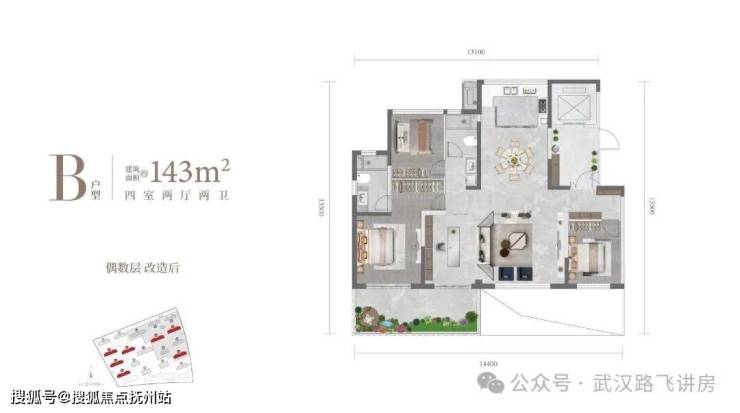 ②143㎡——四房两卫,该户型的12#13#就是全盘面积段最小的小高层产品。居住舒适度会比较高,有全赠送的空中花园设计,约19.25㎡。所以得房率高达106.75%!南向面宽约14.4米,采光和通透性不错。但看这个户型的错层设计,会导致主卧或者客厅的采光受到影响。