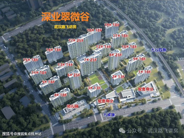 项目位于九峰一路与光谷四路交汇处,鸡公山公园正对面。根据规划,项目由AB两个地块组成,但没有明显的分割。项目一共规划了19栋楼的高层和小高层产品,共计1200户,户均152㎡,妥妥的改善盘。其中:11栋楼为18层,2栋楼为13层,2栋楼为14层,4栋楼为25层。