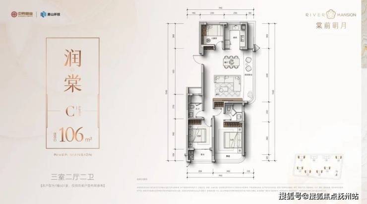 建面约106方三房两卫: