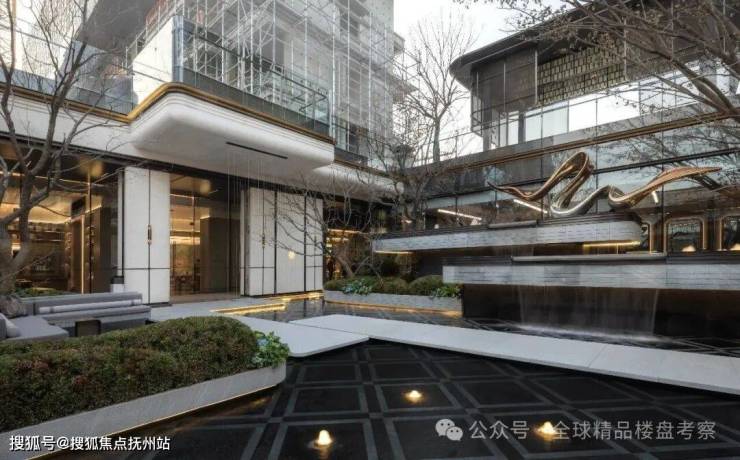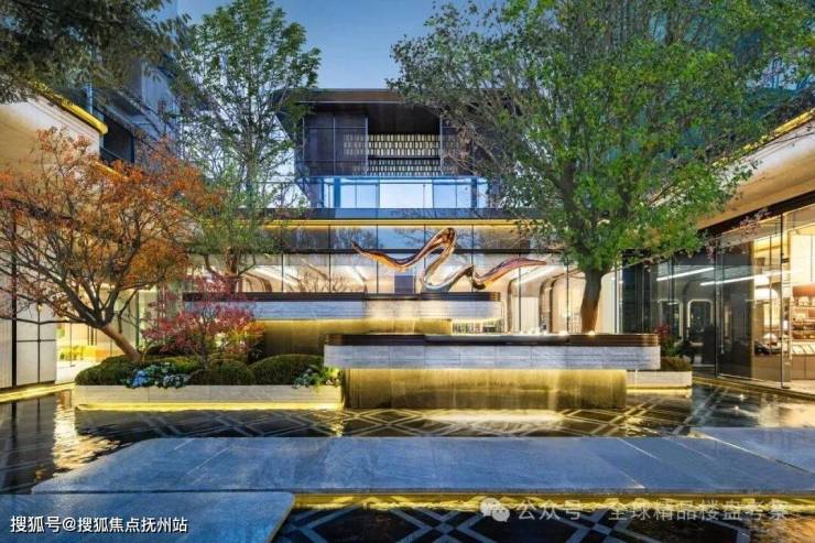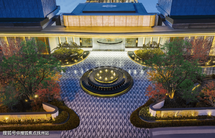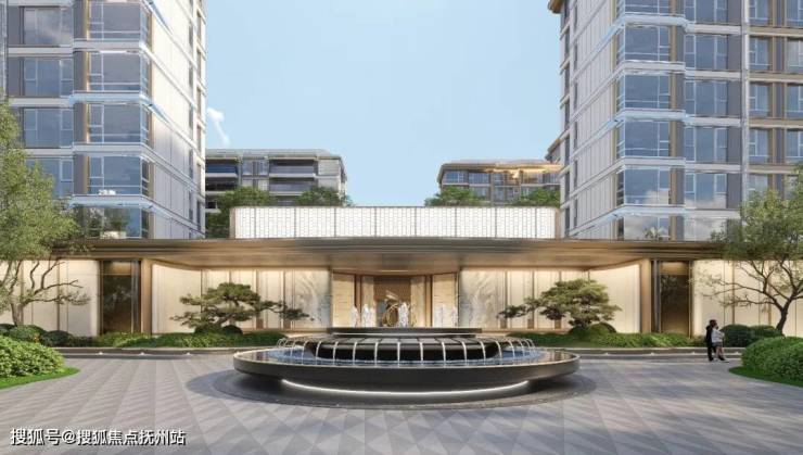 金地·上湾玖峯使绿植有效过滤噪音,景观柔化城市视野,公园就是社区的天然前庭,以公园为归家动线起点,社区主入口就掩映在这一片绿意之中,以环岛式布局与三重叠水雕塑为核心,实现有机视觉引导。